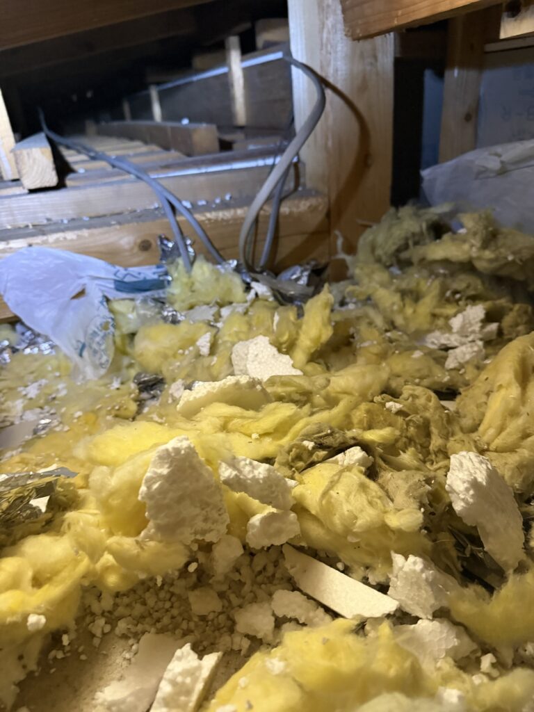 天井裏を覗いて見たところ部分的に断熱材がありましたが全て荒らされていました。